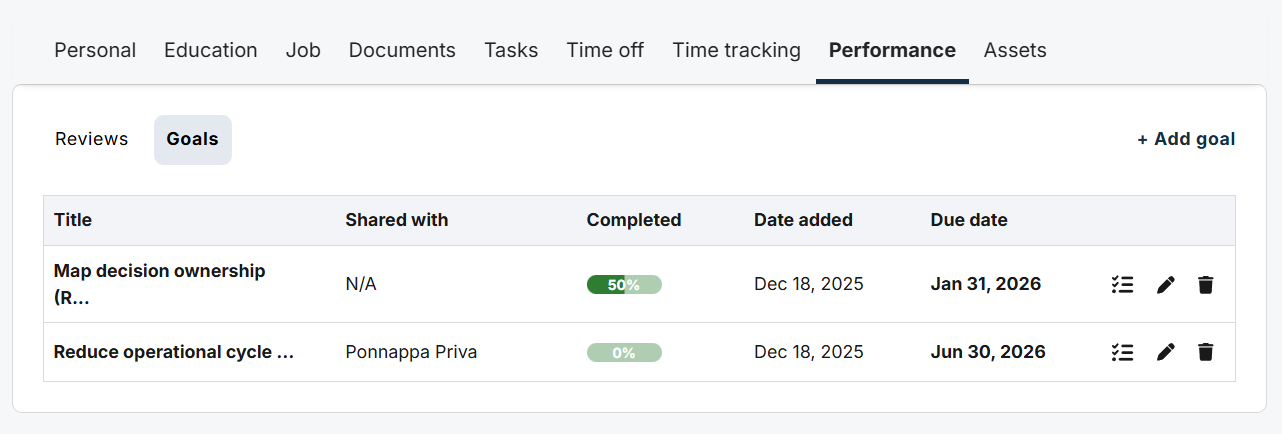 Teams can set clear employee targets, break them into milestones, create shared goals where collaboration is required, and track progress in one place over time. This makes it easier to revisit goals, adjust them when needed, and keep them aligned with current priorities.