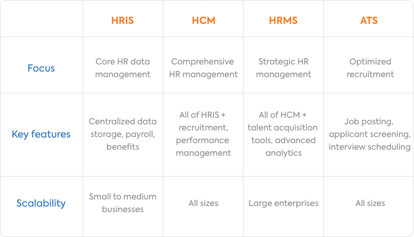 The world of HR software can be a confusing maze of acronyms. We’ll look into the most common HR software types, breaking down their functionalities and ideal users so you can better understand your options through your HR software selection process.