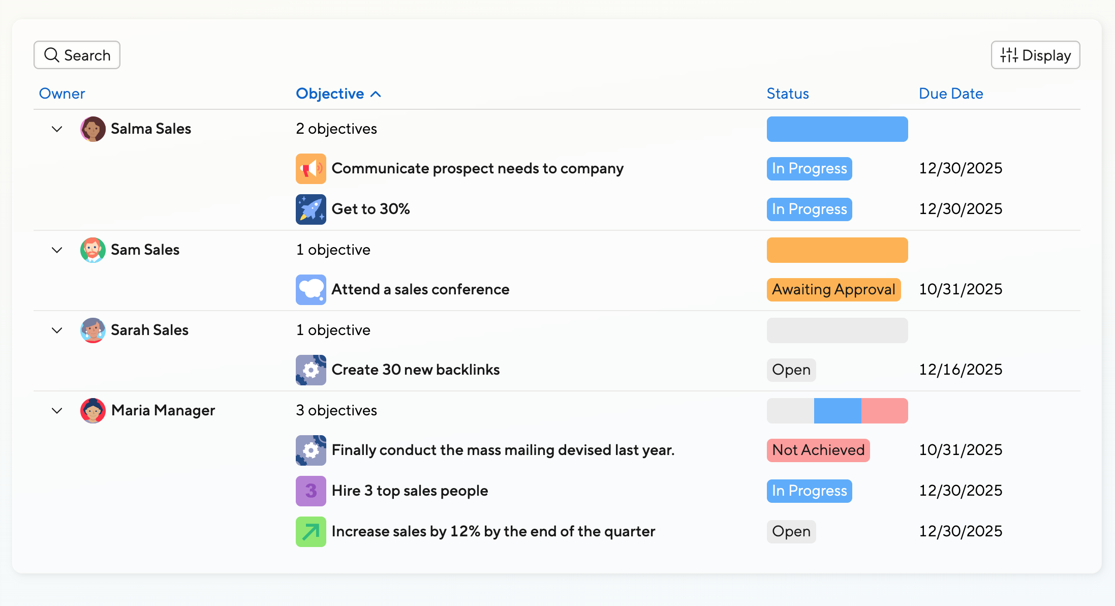 - Goals and OKRs with cascading goals, progress updates, and reminders